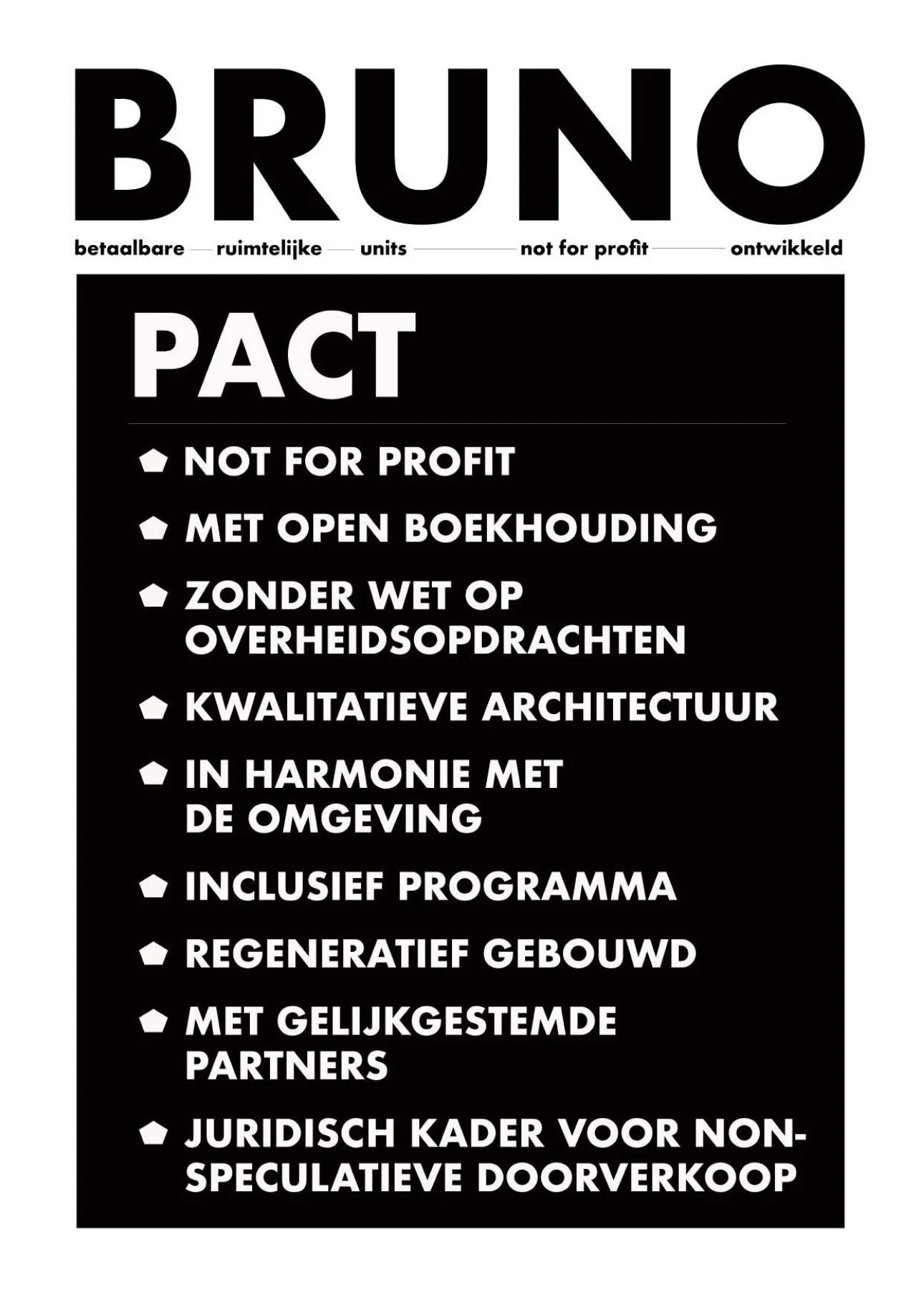 BRUNO streeft geen winstmaximalisatie na voor de ontwikkelaar maar wel voor de maatschappij. Projecten worden zo ontwikkeld dat kwaliteit en betaalbaarheid voorop staan ten gunste van de finale eigenaars.